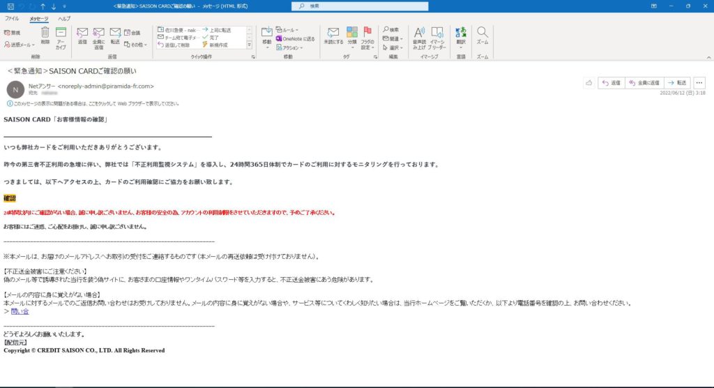 画像のメールもタイトルにはSAISON CARD(セゾンカード)とあるのにメールアドレスは「noreply-admin@priramida-fr.com」とSAISON CARDの文字がどこにも入っておりません。